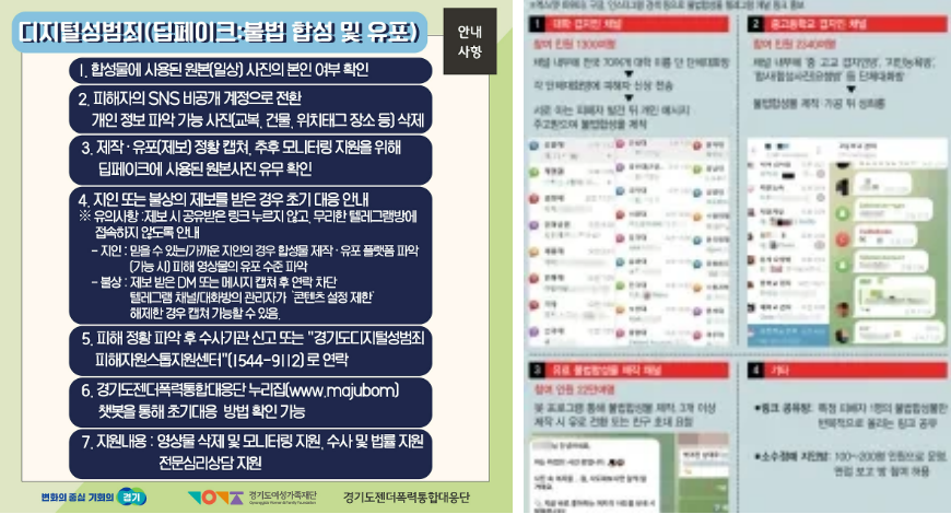 - 디지털 성범죄 예방 교육 정부와 교육당국은 딥페이크를 포함한 디지털 성범죄의 심각성을 인식시키기 위해 교육 프로그램을 강화하고 있습니다. 학생들과 교사들을 대상으로 성범죄 예방 교육을 통해 딥페이크의 위험성과 대응 방법을 안내하고 있습니다.
